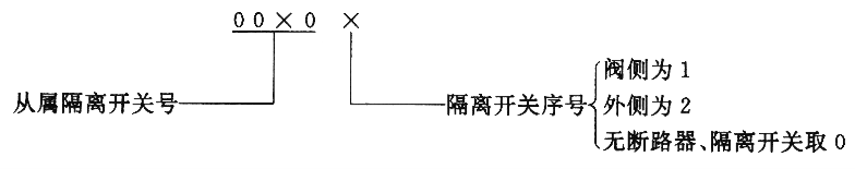 断路器设备由阀桥侧起往线路出线方向,自正接地极至负接地极依次编号,统一采用4位数表示,所代表的意义如下: