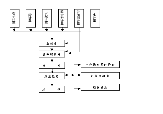 3.2每台班开始前,对搅拌机及上料设备进行检查并试运转;对所用计量器具进行检查并定磅;校对施工配合比;对所用原材料的规格、品种、产地、牌号及质量进行检查,并与施工配合比进行核对;对砂、石的含水率进行检查,如有变化,及时通知试验人员调整用水量。一切检查符合要求后,方可开盘拌制混凝土。 3.3计量: 3.3.1砂、石计量:用手推车上料时,必须车车过磅,卸多补少。有贮料斗及配套的计量设备,采用自动或半自动上料时,需调整好斗门关闭的提前量,以保证计量准确。砂、石计量的允许偏差应≤±3%。 3.3.2水泥计量:搅拌时采用袋装水泥时,对每批进场的水泥应抽查10袋的重量,并计量每袋的平均实际重量。小于标定重量的要开袋补足,或以每袋的实际水泥重量为准,调整砂、石、水及其它材料用量,按配合比的比例重新确定每盘混凝土的施工配合比。搅拌时采用散装水泥的,应每盘精确计量。水泥计量的允许偏差应≤±2%。 3.3.3外加剂及混合料计量:对于粉状的外加剂和混合料,应按施工配合比每盘的用料,预先在外加剂和混合料存放的仓库中进行计量,并以小包装运到搅拌地点备用。液态外加剂要随用随搅拌,并用比重计检查其浓度,用量桶计量。外加剂、混合料的计量允许偏差应≤±2%。 3.3.4水计量:水必须盘盘计量,其允许偏差应≤±2%。。 3.4上料:现场拌制混凝土,一般是计量好的原材料先汇集在上料斗中,经上料斗进入搅拌筒。水及液态外加剂经计量后,在往搅拌筒中进料的同时,直接进入搅拌筒。原材料汇集入上料斗的顺序如下: 3.4.1当无外加剂、混合料时,依次进入上料斗的顺序为石子、水泥、砂。 3.4.2当掺混合料时,其顺序为石子、水泥、混合料、砂。 3.4.3当掺干粉状外加剂时,其顺序为石子、外加剂、水泥、砂或顺序为石子、水泥、砂子、外加剂。 | ||||||