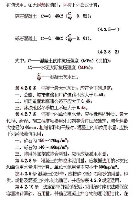 第4.2.1条 混凝土配合比,应保证混凝土的设计强度、耐磨、耐久和混凝土拌合物和易性的要求。在冰冻地区还应符合抗冻性的要求。