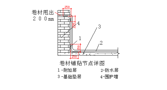 1.4.5 地下室防水应注意转角处、搭接长度以及附加层等几个环节,必须达到规范要求,保证施工质量。按照设计要求,拐角处加铺一层附加层,确保整体防水连续性。