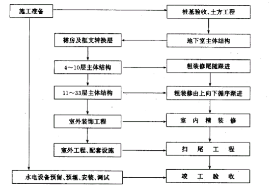 装修工程以施工队为主,组织抹灰工、木工、粉石工等工种的混合队进行专业承包。油漆粉刷由专业队组织力量配合土建进度完成各项任务。水、暖、电、卫根据控制进度计划组织施工,装修进入8层施工时,专业管线必须安装完毕,水暖管线分低压、高压两个阶段试压,在装修终饰面以前完成。
