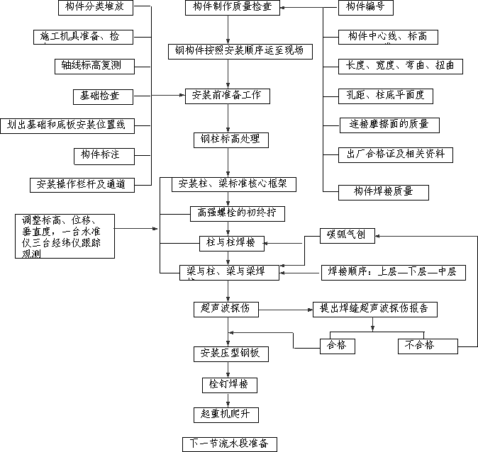 (三)、在构件的安装过程中应按实际情况做好:各隐蔽部位的记录,工程定位记录,结构吊装记录,各部位的技术复核记录,高强螺栓的检查记录,焊缝的外观及二、三级探伤记录,焊条的烘陪记录,各分部的质量验收记录。