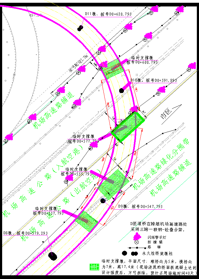 (11)第三段钢桥梁吊装时需现场进行机场高速路(出航空港)及机场高速路(出航空港)辅道的断道施工,并做好交通管制和交通疏通工作。
