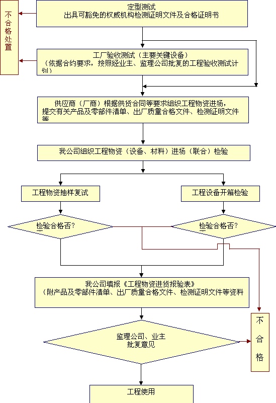 (5)设备、材料进场后,立即按程序组织验货,并将有关资料和可呈交之样品呈报业主进行检测。