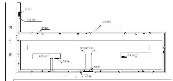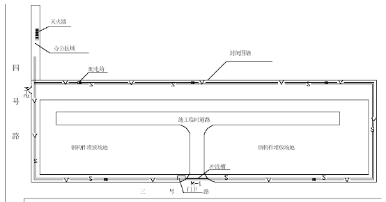 整个施工区域用彩钢板围护封闭,在三号路及东侧开设两个入口,场内临时道路根据现场实际情况进行定位,详“土建施工平面布置图”。