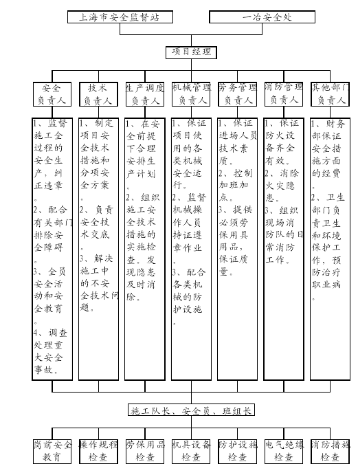 1.成立现场安全生产管理小组,项目经理任组长,专职安全员为副组长,成员包括项目各专业工长、施工作业队班组长,安全工作从上至下当作一个整体来抓。(见附表)