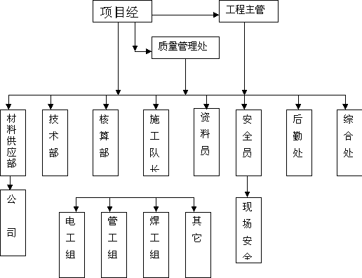 8、后勤处:负责现场施工人员的生活等方面的服务后勤。