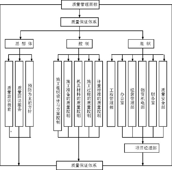 我单位质量保证体系履盖我单位各施工单位。质量方针是我单位质量工作的宗旨;质量目标是我们工程施工的最终目标。质量手册、程序文件和作业指导书是我单位质量保证体系文件。质量保证体系也将在本工程中得到有效的运行。