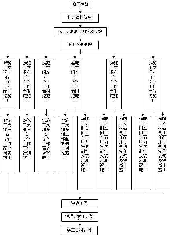 依据施工条件及进度要求引水隧洞段共设置六个施工队进行隧洞开挖,即每个施工支洞设置一个施工队,完成整个隧洞的施工。