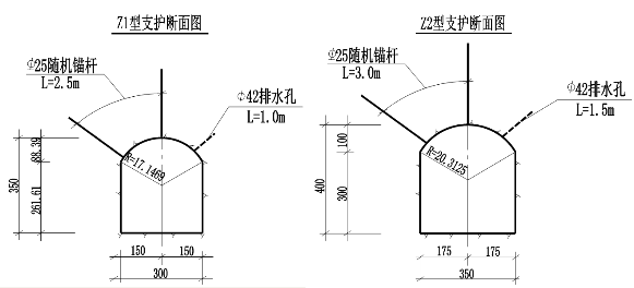 1#、2#、3#、4#施工支洞断面尺寸为Z1型;5#、6#施工支洞断面尺寸为Z2型。支护型式:I、II类围岩采用随机锚杆支护;III类围岩采用系统锚杆加喷混凝土支护。系统锚杆和排水孔均按梅花型布置;随机锚杆视地质情况布置;施工过程中视地质情况及时进行喷锚支护,必要时可采取钢拱架、钢筋混凝土等加强支护措施。