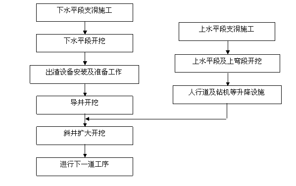 本工程压力钢管段斜井,通过各种方法比较,由于地质钻机吊篮法(先钻先导孔,由下向上扩挖,施工危险性较高)、反井钻机开挖,设备投入较高,经过综合对比,决定采用先开挖导井(导井设置在下部,尺寸1m×1.8m,宽×高,城门洞型,导井出渣由上平段支洞出渣),然后自上向下扩挖,利用导井溜渣,然后由下平段通道出渣,洞挖掘时,临时支护与开挖平行以保证施工安全。在斜井全部全部开挖后,分段安装钢管,分段回填混凝土,其后进行灌浆施工。