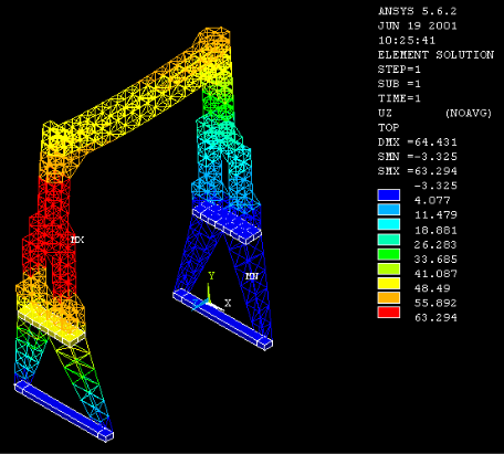 应力分析采用有限元的静力学分析原理,其建模方法采用实体建模法,采用体、面、线、点构造有限元实体。其中所有箱形梁用面素建模,其余用线素建模,然后在实体上划分有限元网格,具体见单元图。对于边界条件和约束条件,是在支撑架下的箱型梁的底面两端加X,Y,Z三方向的约束以模拟龙门起重机的实际情况。载荷分布有4种情况:工作时的吊重、小车自重、风载荷、考虑两度偏摆时的水平惯性力,具体见下。